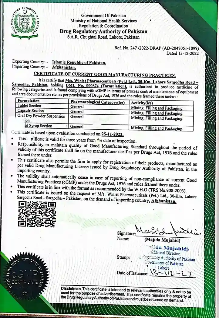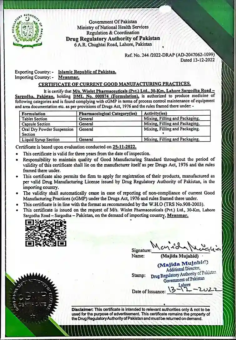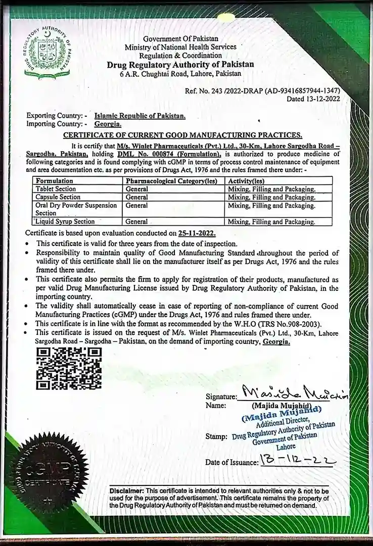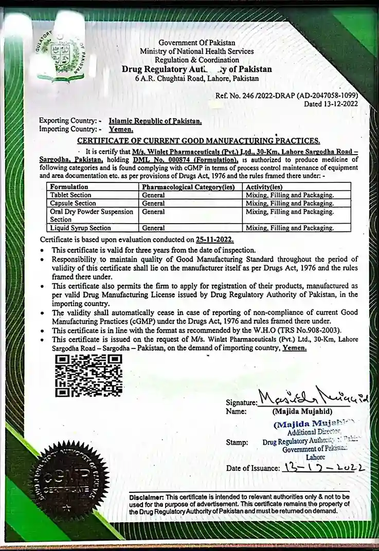Winlet Pharma Certifications for Quality, Safety, and GMP Compliance